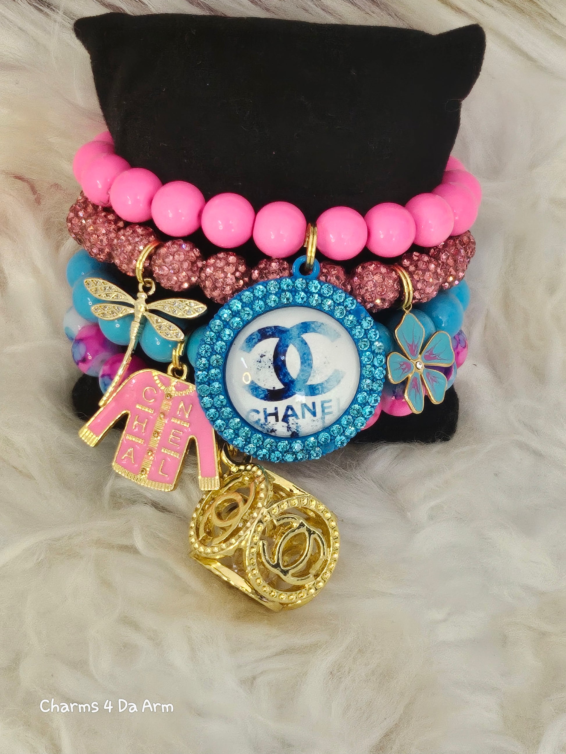 4 piece bracelet set with 5 charms. Chanel inspired. Fits 7 1/2 size wrist. Moderate stretch.